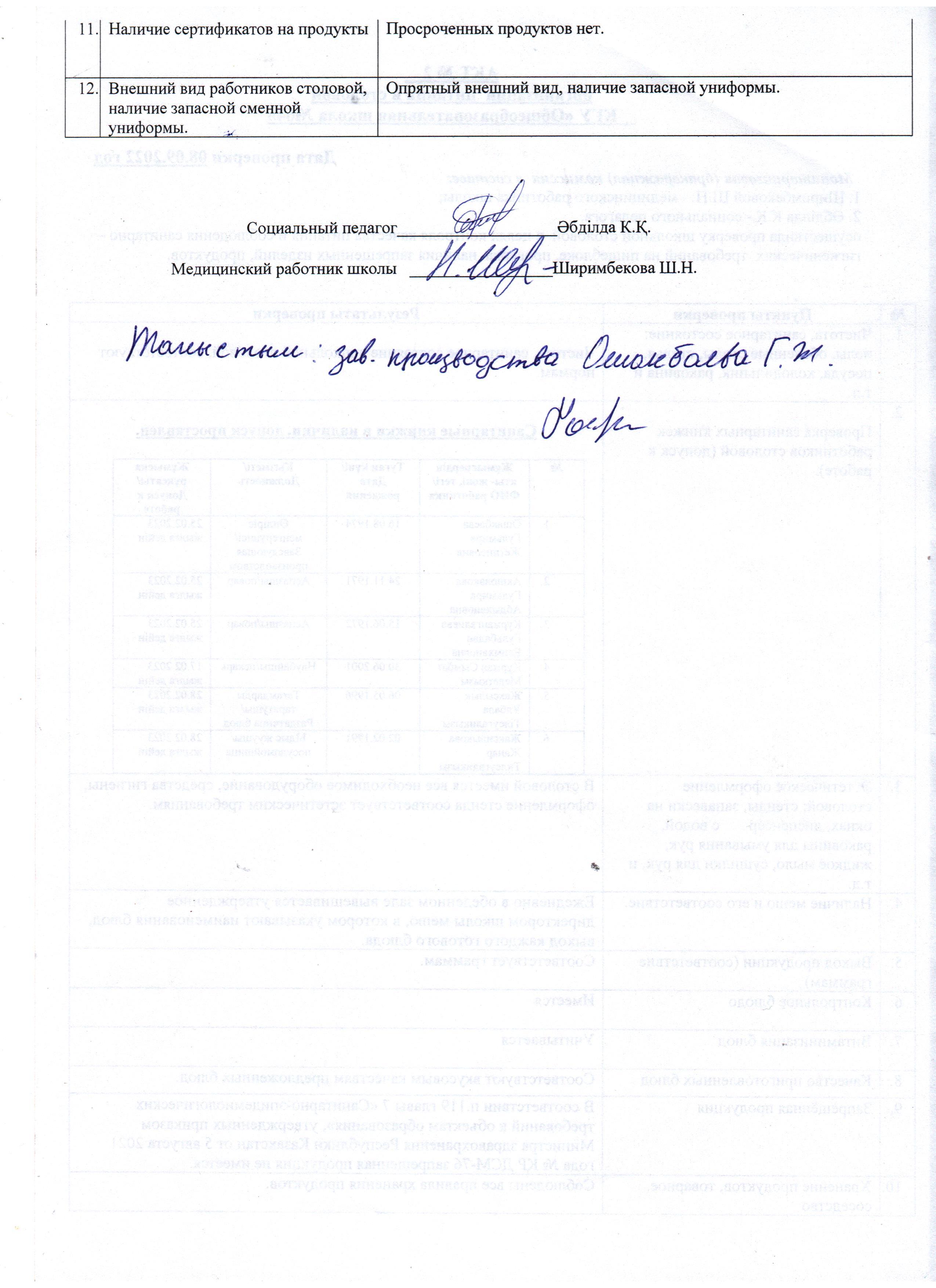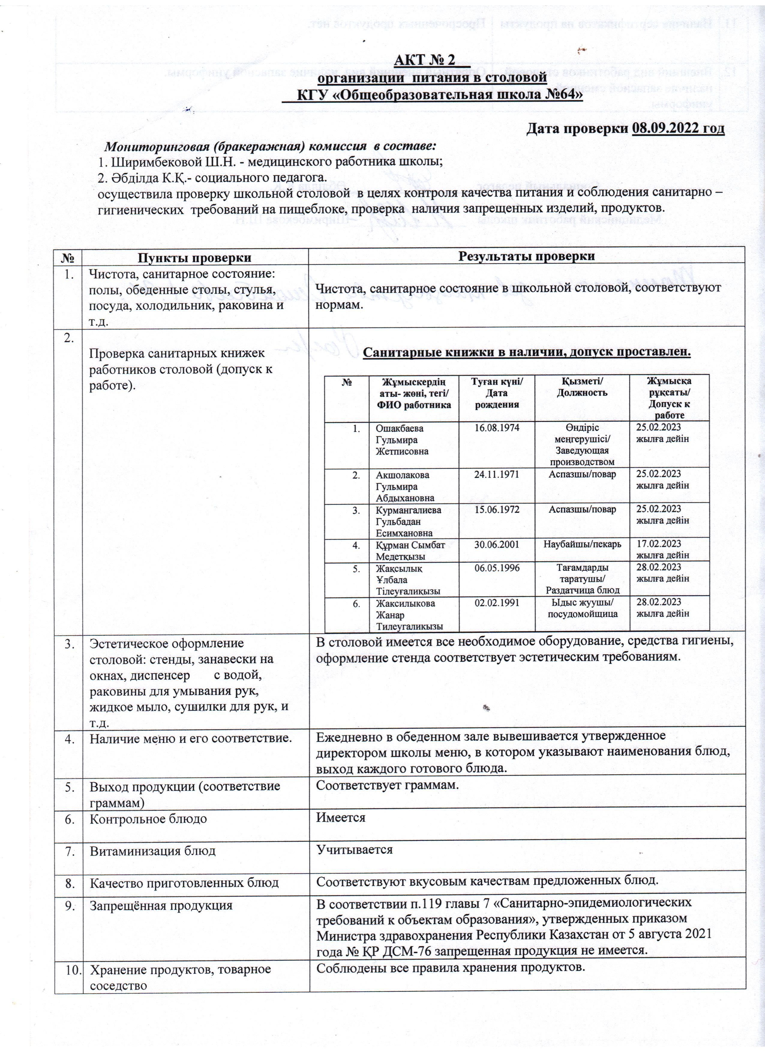 08 сентябрь 2022 0 1 2 3 4 5 Мектеп асханасында тамақтануды ұйымдастырудың №2 Актісі АКТ №2 организации питания в школьной столовой